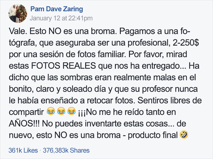 Pam dijo que ha pedido las imágenes originales, pero no quiere un reembolso. Al contrario, ha encontrado el toque de humor en todo la experiencia. Según ella, la sesión de fotos “ha valido la pena cada centavo” por todas las risas que ha provocado.