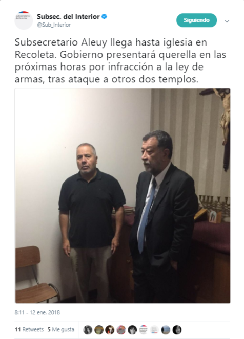 En cuanto a la querella anunciada por Aleuy, la cuenta de Twitter de la Subsecretaría del Interior señala que será por infracción a la ley de armas.