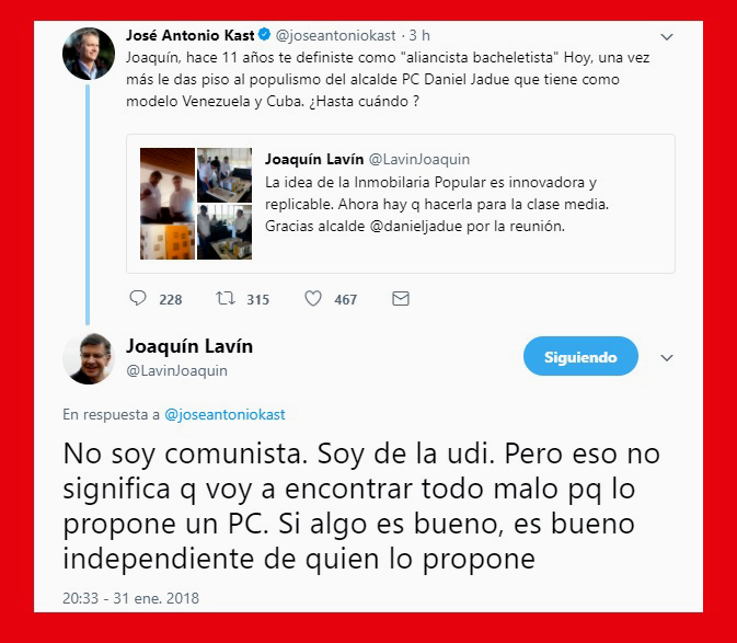 Lavín, no se quedó callado y le respondió: “No soy comunista. Soy de la udi. Pero eso no significa q voy a encontrar todo malo pq lo propone un PC. Si algo es bueno, es bueno independiente de quien lo propone”.