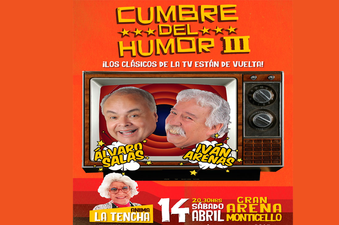 La “Cumbre del Humor 3 – Los clásicos de la TV están de vuelta” promete sorpresas, risas y diversión por montones, en una noche inolvidable que reunirá a dos de los mejores humoristas del país. La cita es el sábado 14 de abril a las 20:30 hrs. en el Gran Arena Monticello. Entradas a la venta a través del sistema TicketPro desde los $10.000 más cargos por servicio.
