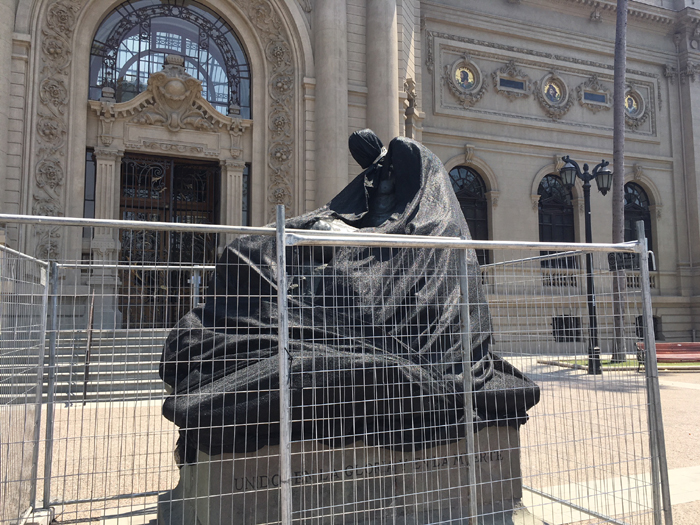 El Museo Nacional de Bellas Artes lamenta el daño causado a la emblemática escultura Unidos en la gloria y en la muerte (1922), de la escultora Rebeca Matte, emplazada en el frontis del edificio.