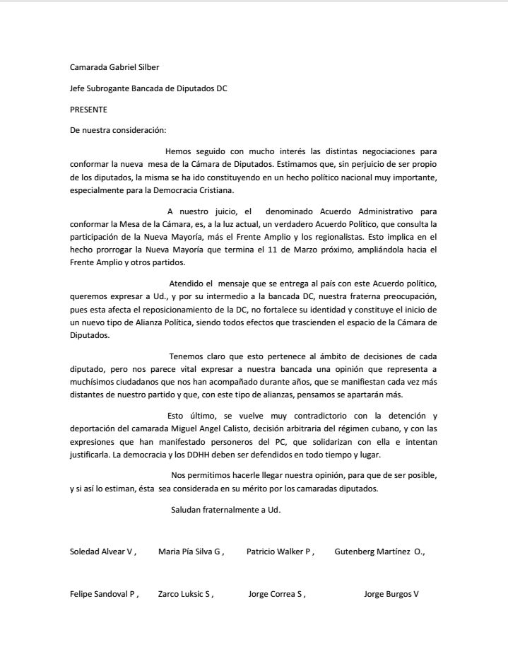 “Esta afecta el reposicionamiento de la DC, no fortalece su identidad y constituye el inicio de un nuevo tipo de alianza Política”, alertan los firmantes de la misiva.