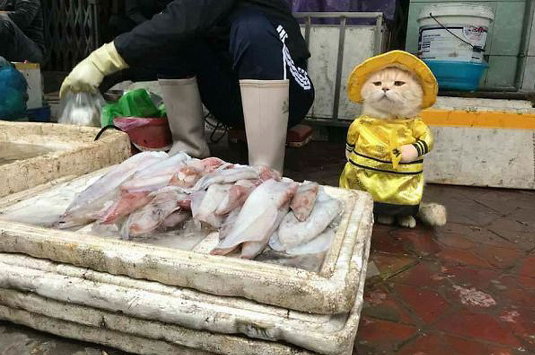 Es un gato de 3 años llamado Dog, y su dueño Le Quoc Phong. Se los puede encontrar en un mercado local, y son fáciles de ver, porque Dog, como buen vendedor, siempre va bien vestido mientras se gana la vida. “Le gusta el helado, viajar y dormir,” dijo Phong. “También tiene muchas novias e hijos en el país.”