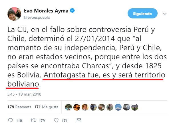 «La CIJ, en el fallo sobre controversia Perú y Chile, determinó el 27/01/2014 que “al momento de su independencia, Perú y Chile, no eran estados vecinos, porque entre los dos países se encontraba Charcas”, y desde 1825 es Bolivia. Antofagasta fue, es y será territorio boliviano», escribió el Presidente boliviano Evo Morales a las 05:45 horas desde La Haya.
