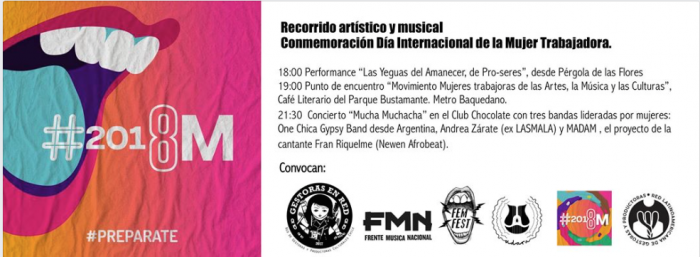 Además Gestoras en Red suma otras interesantes actividades para la tarde de este jueves, entre ellas performance, recorrido artístico y musical “Las Yeguas del Amanecer, de Pro-seres” (18:00 hrs – Pérgola de las Flores) y ya caída la noche, se realizará el concierto “Mucha Muchacha” en el Club Chocolate a las 21:30 horas, con tres bandas lideradas por mujeres: One Chica Gypsy Band desde Argentina, Andrea Zárate (ex LASMALA) y MADAM, el proyecto de la cantante Fran Riquelme (Newen Afrobeat).