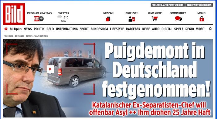 El expresidente catalán Carles Puigdemont fue detenido este domingo poco después de cruzar la frontera desde Dinamarca y fue traslado a un recinto carcelario al norte de Alemania. Puigdemont fue detenido este domingo (25.03.2018) a las 11.19 hora local en una estación de servicio de la autopista A7, a la altura del municipio de Schuby, poco después de entrar en territorio alemán por Dinamarca.