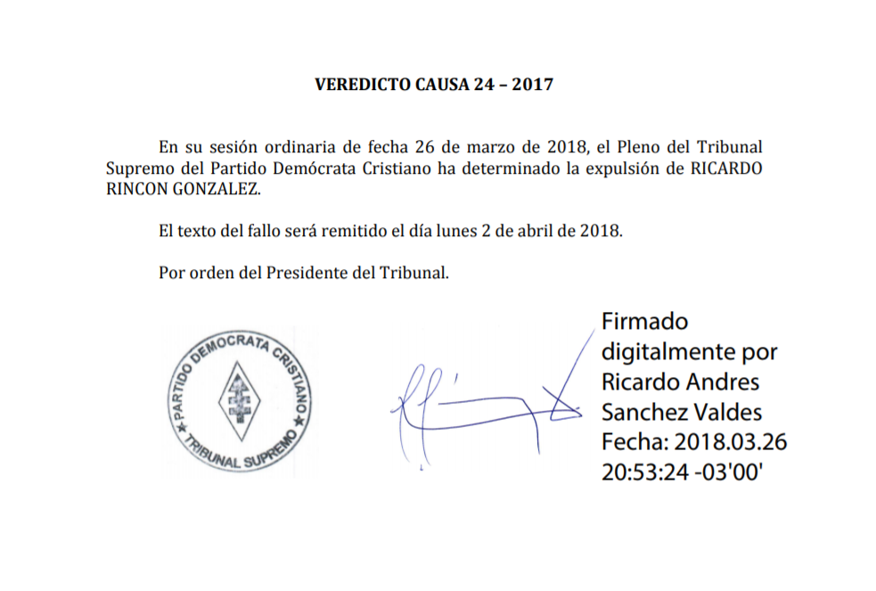 Siguiendo los pasos del Partido Socialista, que expulsa militantes luego que renuncien , la Democracia Cristiana expulsó, cuatro días después que presentara su renuncia ante el Servicio Electoral, al ex parlamentario Ricardo Rincón.