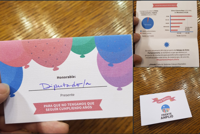De manera lúdica, el Frente Amplio ‘celebró’ el aniversario de un proyecto de ley que duerme hace cuatro años en el Congreso, el que busca reducir la dieta de los parlamentarios que, como dice esta invitación, es uno de los mayores de la OCDE.