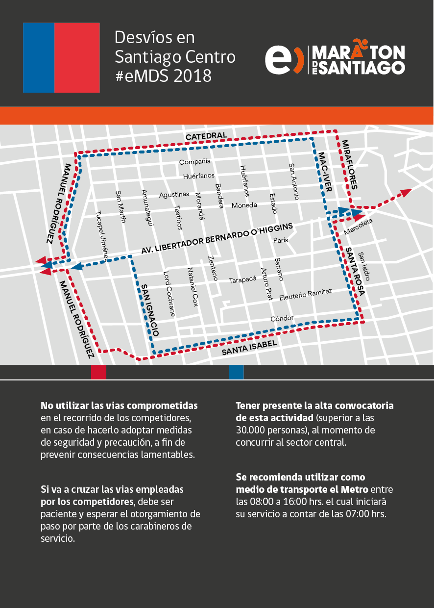 La Maratón de Santiago –cuyo circuito fue aprobado por la Asociación Internacional de Federaciones Atléticas y la Asociación Internacional de Maratones tendrá inconvenientes para quienes transiten en vehículos y en locomoción colectiva durante la medianoche del domingo hasta las 16 horas del mismo.