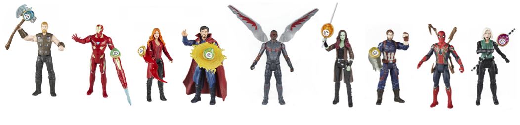 Además, se destacan las figuras de 15 cm. que vienen con una Gema del Infinito que se conecta al accesorio incluido. Las gemas también se pueden utilizar para desbloquear efectos en el juego Marvel Avengers: Infinity War Fall y en el juego de la batalla Infinity War Thanos. El surtido incluye tres figuras nuevas inspiradas en la película.