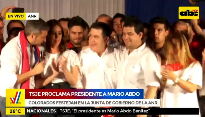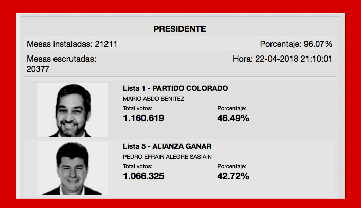 El presidente del TSJE, Jaime Bestard, anunció que ha sido electo residente de la República del Paraguay el candidato colorado. “Tenemos una diferencia marcada a favor de un candidato. Es absolutamente irreversible. Aclaro que la transmisión de las últimas mesas pendientes va a continuar. Quedan 1.000 mesas a ser cargadas, pero eso hace imposible que se revierta el resultado. El ganador es el señor Mario Abdo Benítez”, aseguró.