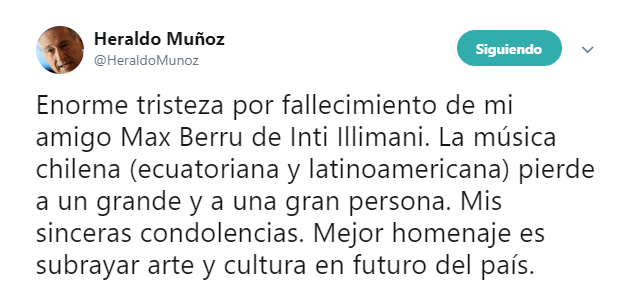 El ex canciller Heraldo Muñoz escribió: “Enorme tristeza por fallecimiento de mi amigo Max Berru de Inti Illimani. La música chilena (ecuatoriana y latinoamericana) pierde a un grande y a una gran persona. Mis sinceras condolencias. Mejor homenaje es subrayar arte y cultura en futuro del país”.