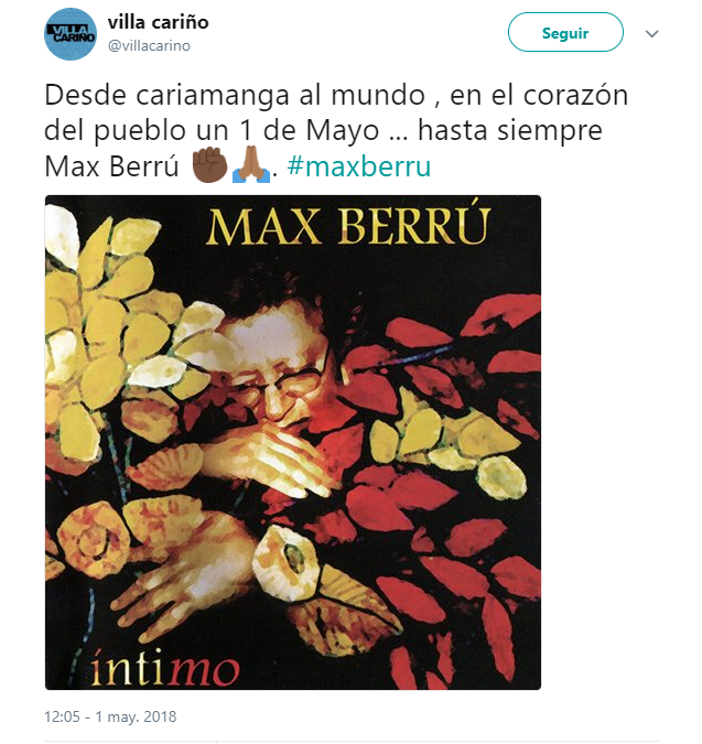 El grupo Villa Cariño también expresó su pesar por la partida de Berrú, indicando que “Desde cariamanga al mundo , en el corazón del pueblo un 1 de Mayo … hasta siempre Max Berrú ✊???. #maxberru”.