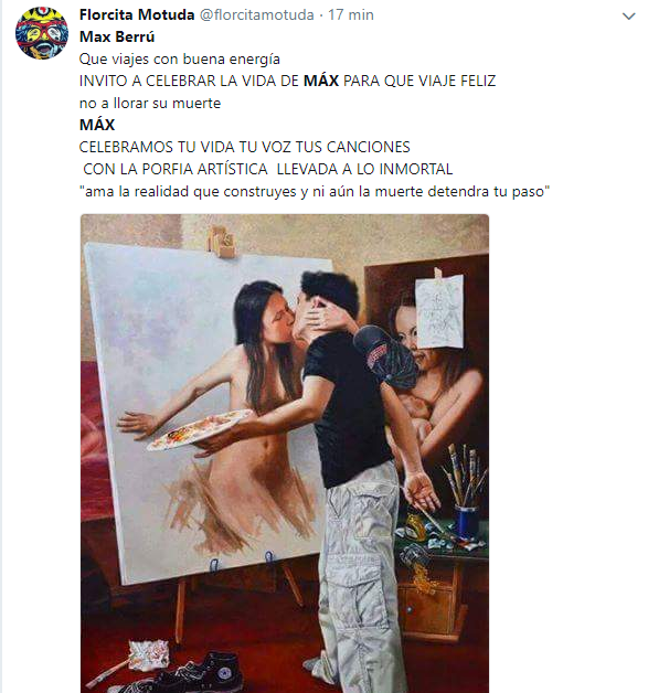A su vez, el músico y ahora diputado, Florcita Motuda, menciona que “Max Berrú Que viajes con buena energía INVITO A CELEBRAR LA VIDA DE MÁX PARA QUE VIAJE FELIZ no a llorar su muerte MÁX CELEBRAMOS TU VIDA TU VOZ TUS CANCIONES CON LA PORFIA ARTÍSTICA LLEVADA A LO INMORTAL «ama la realidad que construyes y ni aún la muerte detendra tu paso«”.