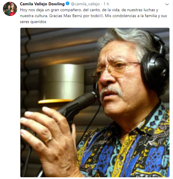 La diputada del PC, Camila Vallejo, posteó: “Hoy nos deja un gran compañero, del canto, de la vida, de nuestras luchas y nuestra cultura. Gracias Max Berrú por todo!!!. Mis condolencias a la familia y sus seres queridos”.