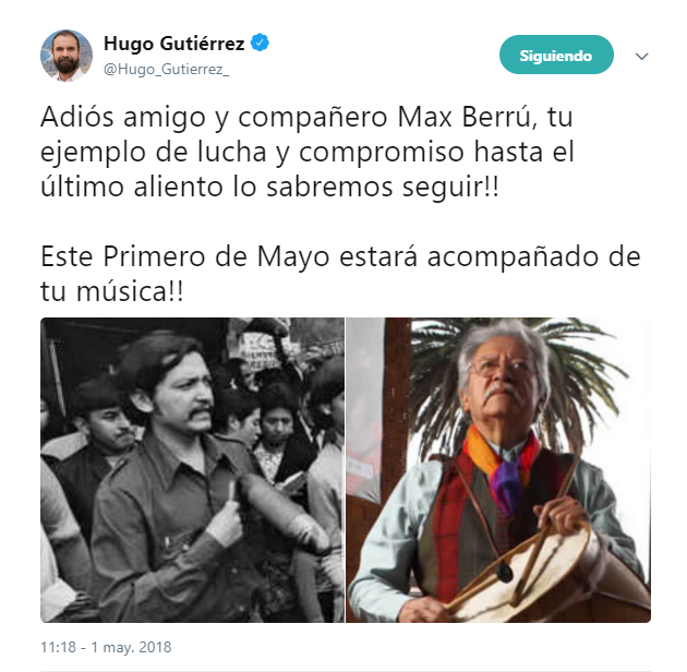El diputado del PC, Hugo Gutiérrez, señaló que “Adiós amigo y compañero Max Berrú, tu ejemplo de lucha y compromiso hasta el último aliento lo sabremos seguir!! Este Primero de Mayo estará acompañado de tu música!!