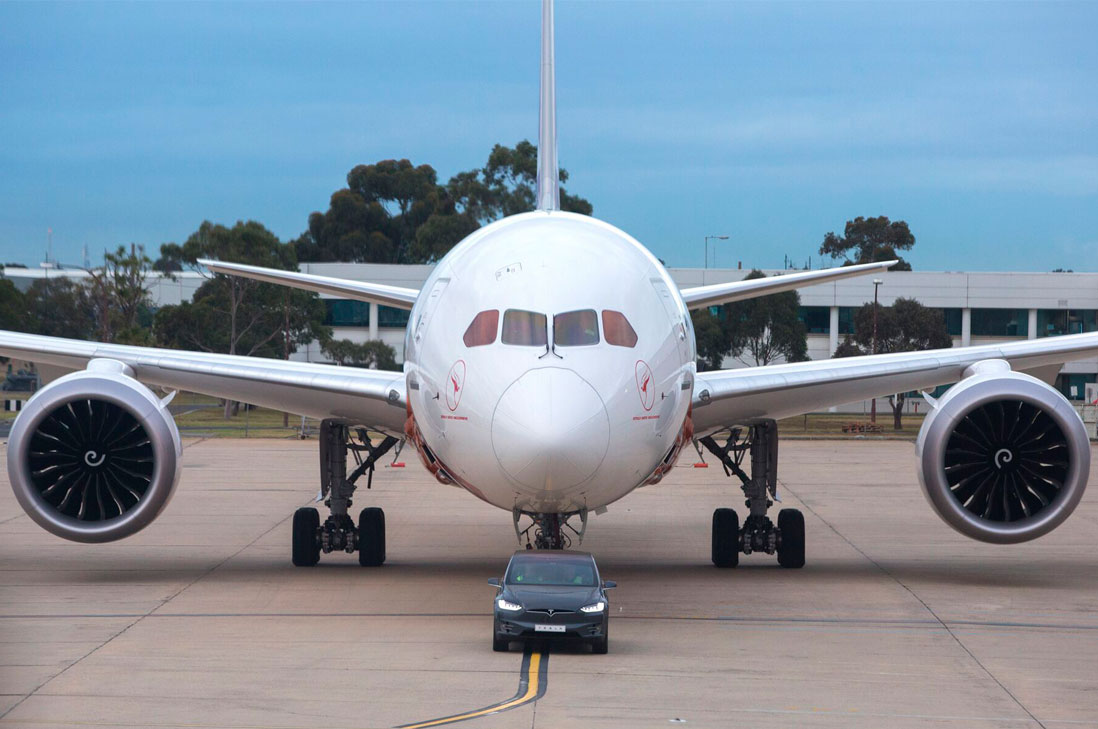 La aerolínea Australiana Qantas y el fabricante de autos eléctricos Tesla llevaron a cabo este martes una primicia mundial en el aeropuerto de Melbourne, al remolcar un Boeing 787-9 Dreamliner de Qantas con un modelo X P100D de Tesla, logrando con éxito el remolque más pesado de la historia realizado por un vehículo eléctrico de pasajeros.