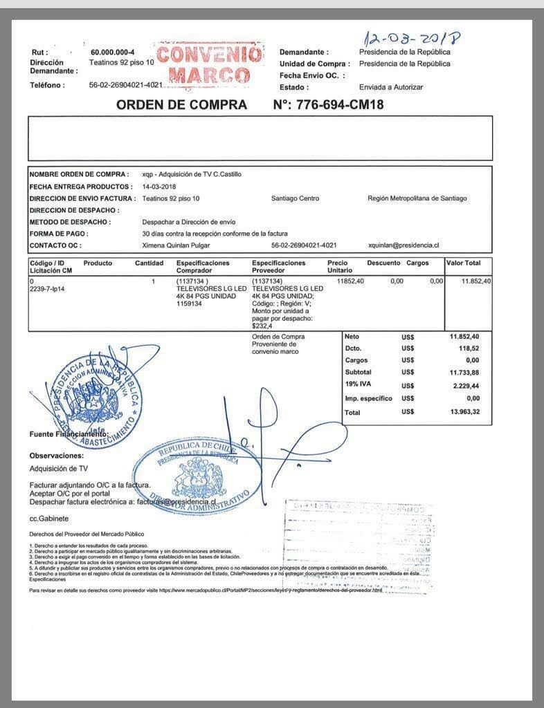 Según refleja el documento a continuación, este televisor fue adquirido vía Mercado Público y pagado en dólares, el que sería perfecto para los fanáticos del fútbol por su calidad.