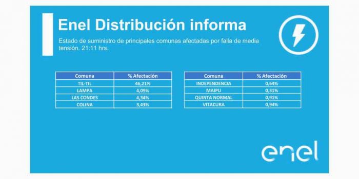 Según la información difundida por la cuestionada compañía de electricidad ENEL , son 8 las comunas afectadas: Las Condes, Vitacura, Independencia, Maipú, Quinta Normal, Colina, Lampa y Til Til.