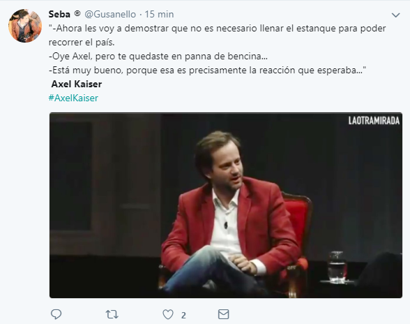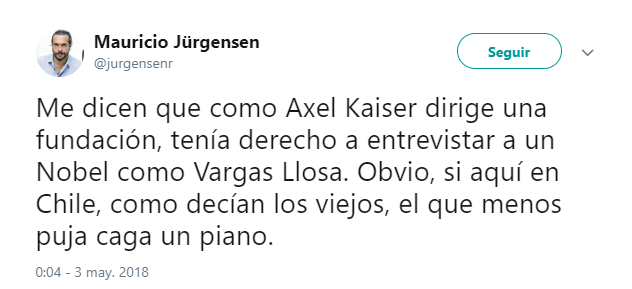 A su vez, otro periodista Mauricio Jürgensen señaló que “Me dicen que como Axel Kaiser dirige una fundación, tenía derecho a entrevistar a un Nobel como Vargas Llosa. Obvio, si aquí en Chile, como decían los viejos, el que menos puja caga un piano”.
