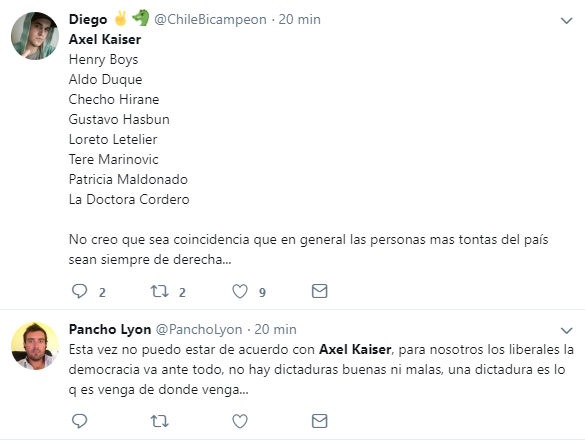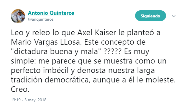 Uno de ellos fue el periodista Antonio Quinteros, quien en su cuenta escribió que “Leo y releo lo que Axel Kaiser le planteó a Mario Vargas LLosa. Este concepto de «dictadura buena y mala» ????? Es muy simple: me parece que se muestra como un perfecto imbécil y denosta nuestra larga tradición democrática, aunque a él le moleste. Creo”.