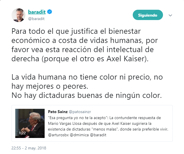 Otro que reaccionó fue el escritor Jorge Baradit, quien posteó que “Para todo el que justifica el bienestar económico a costa de vidas humanas, por favor vea esta reacción del intelectual de derecha (porque el otro es Axel Kaiser). La vida humana no tiene color ni precio, no hay mejores o peores. No hay dictaduras buenas de ningún color”.