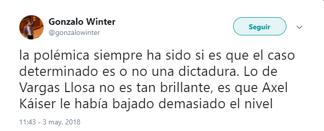 En tanto, el diputado del Movimiento Autonomista, Gonzalo Winter, dijo que “La polémica siempre ha sido si es que el caso determinado es o no una dictadura. Lo de Vargas Llosa no es tan brillante, es que Axel Káiser le había bajado demasiado el nivel”.