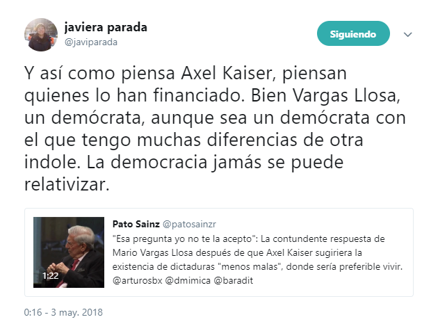 Javiera Parada también participó este debate y precisó que “Y así como piensa Axel Kaiser, piensan quienes lo han financiado. Bien Vargas Llosa, un demócrata, aunque sea un demócrata con el que tengo muchas diferencias de otra indole. La democracia jamás se puede relativizar”.