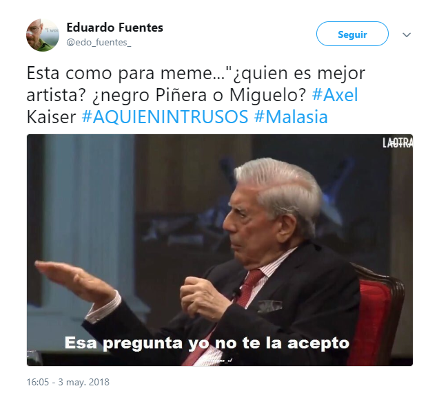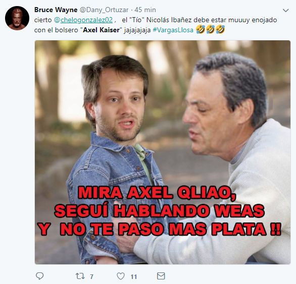 La impensable parada de carro del Premio Nóbel, Mario Vargas Llosa, al autodenominado intelectual de derecha y escritor de best Sellers, Axel Kaiser, incendio Twitter y los internautas aprovecharon de lanzarse con burlar contra el director ejecutivo de la Fundación Para el Progreso y hacer los conocidos memes que pululan en Internet.