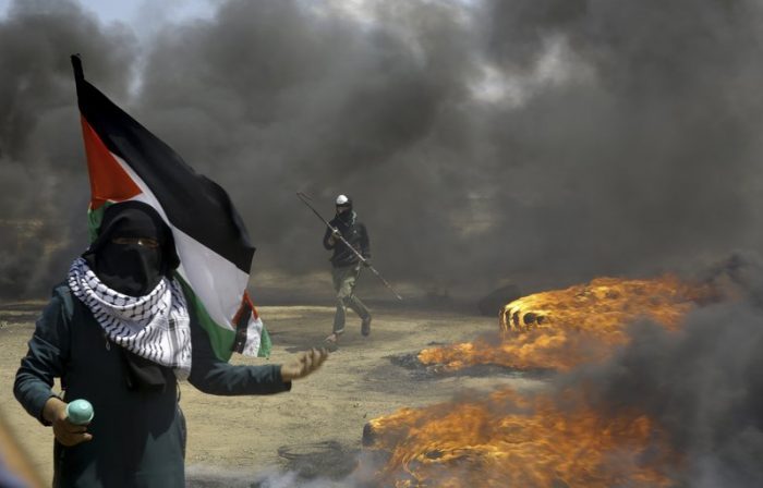 En una demostración de ira impulsada por la maniobra de lainauguración de la embajada en Jerusalén, los manifestantes prendieron fuego a las llantas, enviando columnas de humo negro al aire y arrojaron bombas incendiarias y piedras hacia las tropas israelíes al otro lado de la frontera. El ejército israelí dijo que sus tropas habían sido atacadas y acusó a los manifestantes de tratar de romper la valla fronteriza. Dijo que las tropas dispararon y mataron a tres palestinos que intentaban colocar una bomba.
