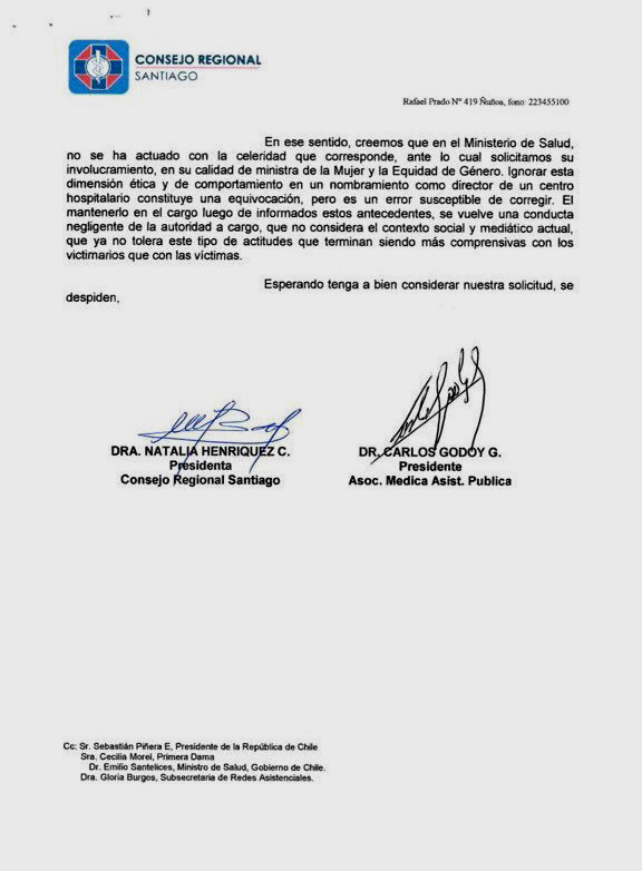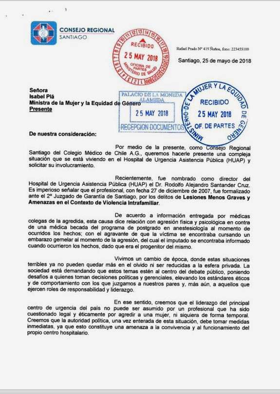 Por su parte el Consejo Regional de Santiago del Colegio Médico, a través de una carta dirigida a la minsitra de la Mujer y Equidad de Género, exigió la salida del médico Rodolfo Santander Cruz como nuevo director del Hospital de Urgencia Asistencia Pública.