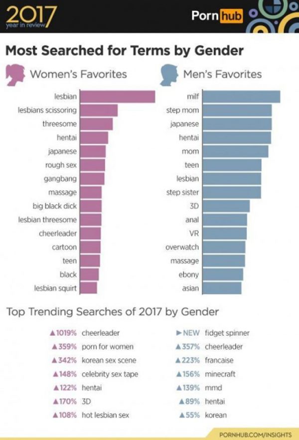 El estudio ha revelado que lo más buscado por mujeres son los términos «lesbiana», «lesbiana tijera» y «trío» mientras que los hombres buscan en mayoría «MILF» y «madrasta». Términos que demuestran que las mujeres se interesan más por el acto en sí mismo y la diversidad sexual. El hecho de que mujeres heterosexuales busquen contenidos lésbicos puede ser una manera de reafirmar su sexualidad y de buscar sus propios límites. Los hombres por su parte se sienten más atraídos por mujeres con experiencia y lazos familiares: hermanos, suegra… El término «cheerleader» es el que ha tenido un mayor incremento con más de 1.000% en los motores de búsqueda. Riley Reid sigue siendo una de las celebrities más buscadas en este ámbito.