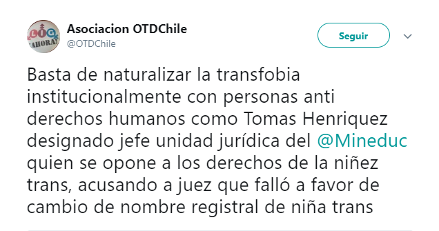 Una de las primeras en manifestar su desacuerdo fue la asociación “Organización Trans Diversidades”, que escribió en Twitter: “Basta de naturalizar la transfobia institucionalmente con personas anti derechos humanos como Tomas Henriquez designado jefe unidad jurídica del Ministerio de Educación quien se opone a los derechos de la niñez trans, acusando a juez que falló a favor de cambio de nombre registral de niña trans”.
