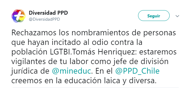 A su vez, el grupo “Diversidad PPD” se sumó a los reclamos y posteó que “Rechazamos los nombramientos de personas que hayan incitado al odio contra la población LGTBI.Tomás Henriquez: estaremos vigilantes de tu labor como jefe de división jurídica de @mineduc. En el @PPD_Chile creemos en la educación laica y diversa”.