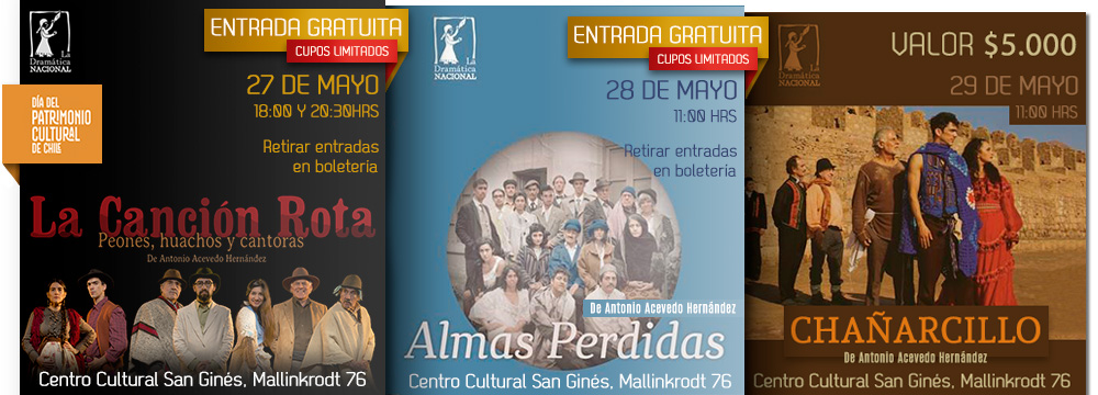 En el marco de este evento, el domingo 27 de mayo se presentarán dos funciones gratuitas de la obra teatral «La Canción Rota», a las 18:00 hrs y a las 20:30 horas. La obra dirigida por Nelda Muray, Carolina Rebolledo y Carolina Araya, es una producción de la compañía La Dramática Nacional, que presenta este montaje basado en el texto del mismo nombre de Antonio Acevedo Hernández, uno de los dramaturgos más importantes de la historia del teatro Chileno y Latinoamericano.