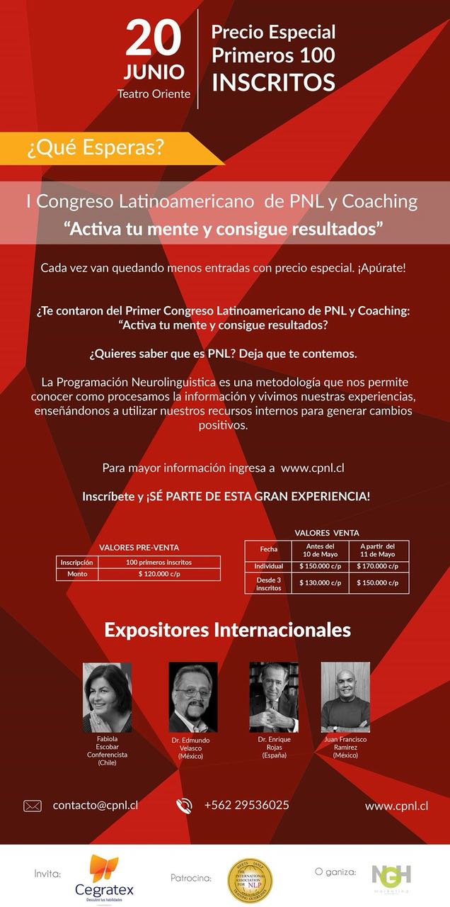 Este Congreso, que se realizará en el mes de junio, trata principalmente el PNL o la Programación Neurolingüística, no muy conocida en nuestro país, pero que a nivel mundial permite lograr grandes cambios en la vida de cada persona.
