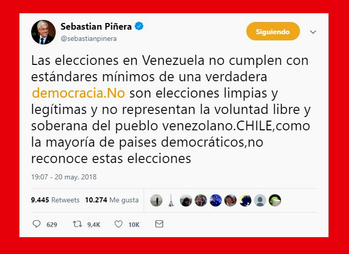 El Presidente Sebastián Piñera, tuiteó: «Las elecciones en Venezuela no cumplen con estándares mínimos de una verdadera democracia. No son elecciones limpias y legítimas y no representan la voluntad libre y soberana del pueblo venezolano.CHILE,como la mayoría de paises democráticos,no reconoce estas elecciones», sumándose así a lo que venía anunciando hace meses el Grupo de Lima que se ha opuesto a estas elecciones por considerarlas ilegítimas.