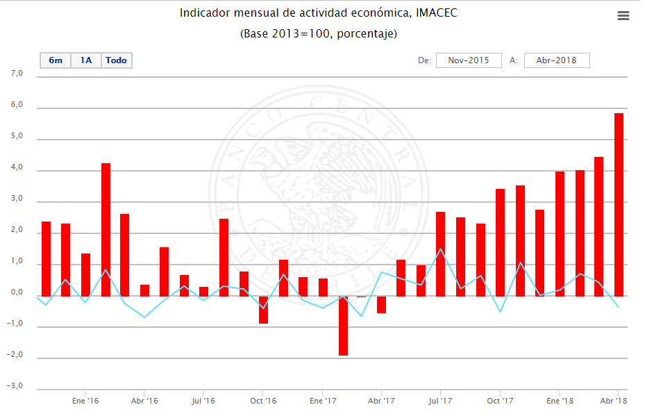 El Banco Central dio a conocer este martes el Indicador Mensual de Actividad Económica (IMACEC), el cual en abril de este año creció un 5,9% en comparación con igual mes del año anterior.