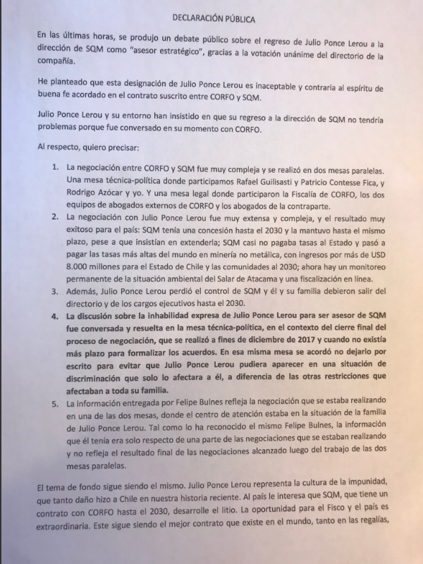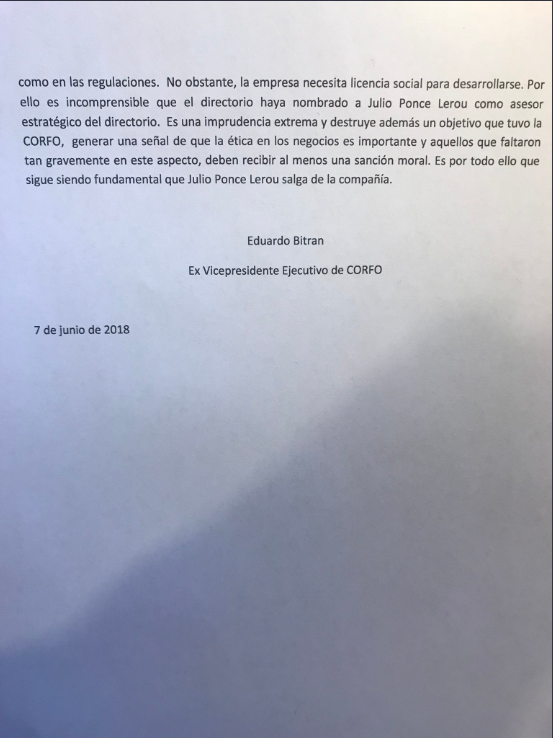 Sin embargo, aclara que la empresa necesita licencia social para desarrollarse, “por ello es incomprensible que el directorio haya nombrado a Julio Ponce Lerou como asesor estratégico del directorio. Es una imprudencia extrema y destruye además un objetivo que tuvo la Corfo, generar una señal de que la ética en los negocios es importante y aquellos que faltaron tan gravemente en este aspecto, deben recibir al menos una sanción moral. Es por todo ello que sigue siendo fundamental que Julio Ponce Lerou salga de la compañía”.
