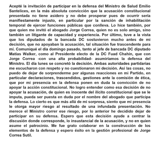 A través de un comunicado publicado en su cuenta en Twitter, Burgos explica que “acepté la invitación de participar en la defensa del Ministro de Salud Emilio Santelices, en la más absoluta convicción que la acusación constitucional presentada no tiene asidero y no debe prosperar pues de ocurrir sería manifiestamente injusto, en particular por la sanción de inhabilitación temporal de ejercer funciones públicas que conlleva. Lo hice también, porque quien me invitó el abogado Jorge Correa, quien no es solo amigo, sino también un litigante de capacidad y experiencia”.