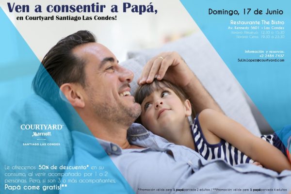 El restaurante The Bistro de Courtyard ofrecerá un 50% de descuento en consumo para todas las padres que sean acompañadas por hasta dos personas el próximo 17 de junio. En caso de que sean acompañadas por tres o más personas, el papá tendrá un descuento de 100% en su consumo. Además, recibirán un obsequio sorpresa y un “Welcome drink” de cortesía. Todo para que se sienta el más regaloneado en su día.