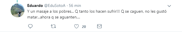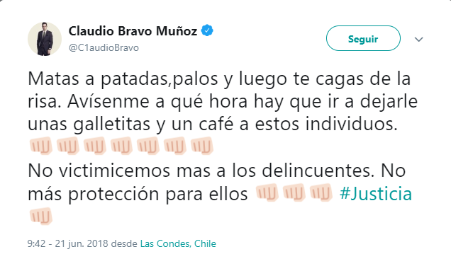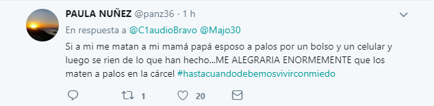 El tuit señala “Matas a patadas,palos y luego te cagas de la risa. Avísenme a qué hora hay que ir a dejarle unas galletitas y un café a estos individuos. No victimicemos mas a los delincuentes. No más protección para ellos #Justicia”, acompañado su mensaje con una manos en forma de puño.