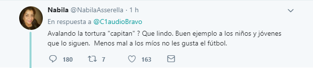 Una de las internautas de la red social, Nabila posteó lo siguiente: “Avalando la tortura «capitan» ? Que lindo. Buen ejemplo a los niños y jóvenes que lo siguen.  Menos mal a los míos no les gusta el fútbol”.