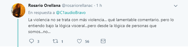 Por su parte, Rosario Orellana coloca que “La violencia no se trata con más violencia… qué lamentable comentario, pero lo entiendo bajo la lógica visceral…pero desde la lógica de personas que somos…no…”.