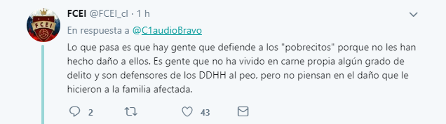 Lo que pasa es que hay gente que defiende a los «pobrecitos» porque no les han hecho daño a ellos. Es gente que no ha vivido en carne propia algún grado de delito y son defensores de los DDHH al peo, pero no piensan en el daño que le hicieron a la familia afectada”, escribió FCEI.