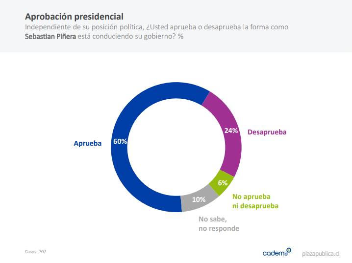 A su vez, la aprobación del Presidente Sebastián Piñera aumentó por cuarta semana consecutiva y alcanzó un 60%, mientras que su desaprobación alcanzó un 24%.