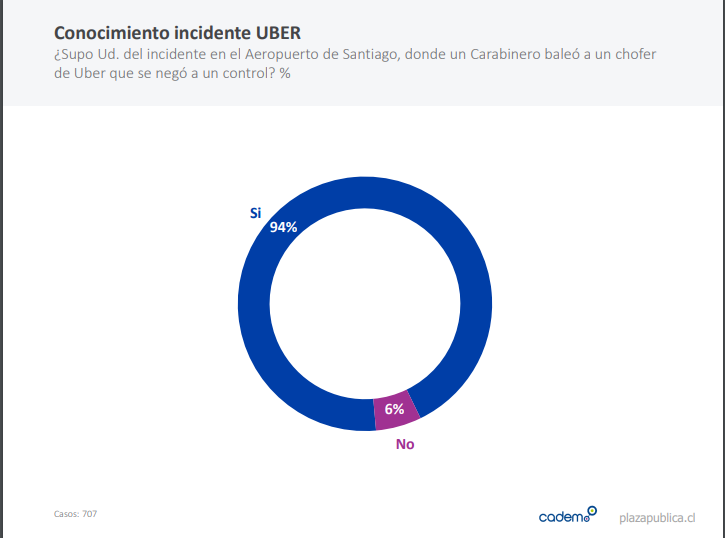 La semana estuvo marcada principalmente por el incidente en Aeropuerto de Santiago, donde un funcionario policial disparó en dos oportunidades a un chofer de Uber que se negó a un control de identidad, hecho que alcanzó un 94% de conocimiento.