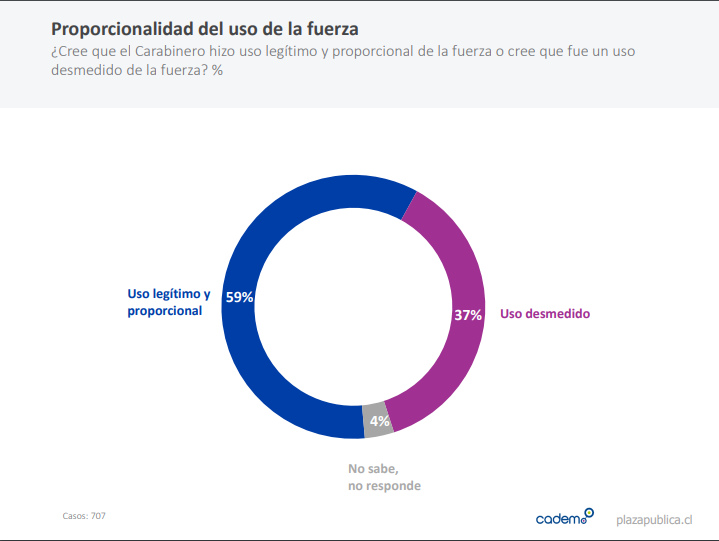 Asimismo, un 59% considera que el Carabinero hizo uso legítimo y proporcional de la fuerza mientras que un 37% opina que hizo un uso desmedido de la fuerza.