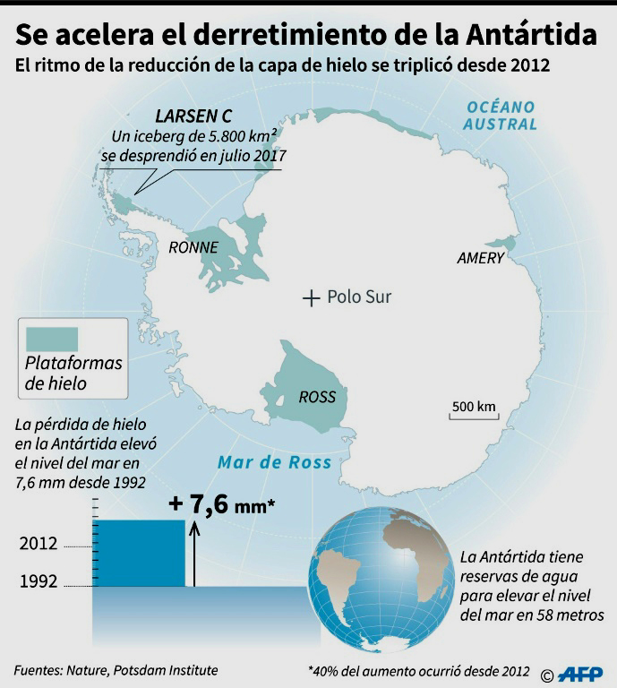 Un 40% de este desprendimiento ocurrió en los últimos cinco años, es decir, el ritmo de achicamiento de la capa de hielo del continente se triplicó en ese periodo, indicaron los autores de la investigación, un consorcio internacional de 84 científicos, en la revista Nature.