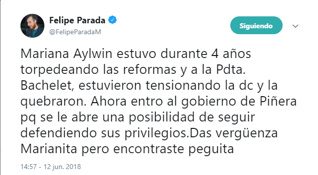 Felipe Parada, posteó que “Mariana Aylwin estuvo durante 4 años torpedeando las reformas y a la Pdta. Bachelet, estuvieron tensionando la dc y la quebraron. Ahora entro al gobierno de Piñera pq se le abre una posibilidad de seguir defendiendo sus privilegios.Das vergüenza Marianita pero encontraste peguita”.